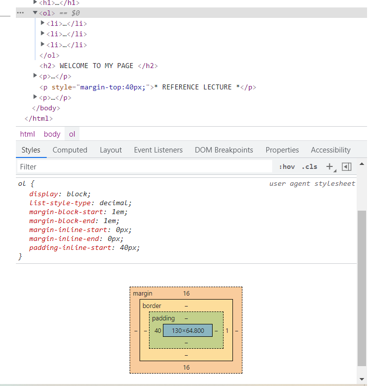 우선, 아래 코드를 보면, 우리가 스타일을 지정해준 <ol>부분은
