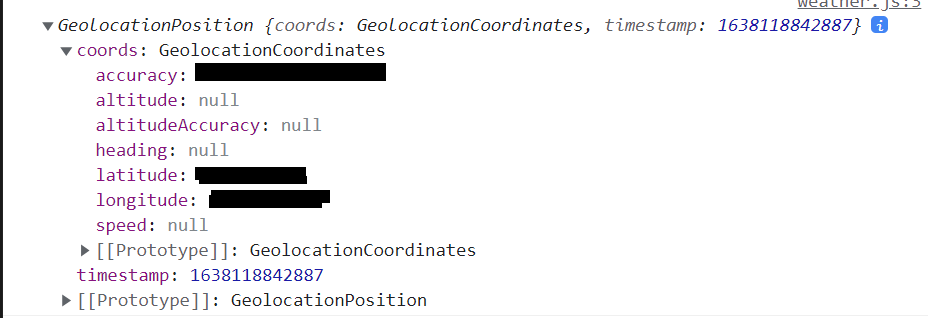+) 그 외에도 speed, altitude(고도), accuracy(정확도) 등의 정보도 있다.>> ❕ speed는 getCurrentPosition 말고 watchPosition 메소드로 얻을 수 있음!