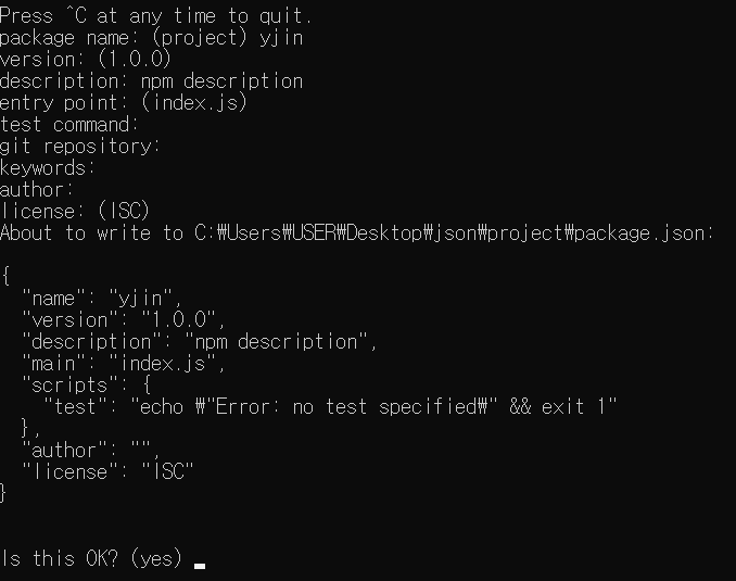 - cmd에 npm init 명령어 (직접 cd [폴더경로]로 이동 후에 해야함)
