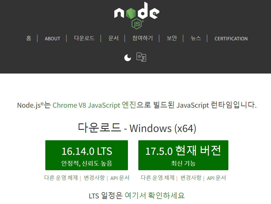 자바스크립트는 기존 브라우저에서도 지원을 하는 거지만, Node.js는 서버이기 때문에 설치가 필요합니다.