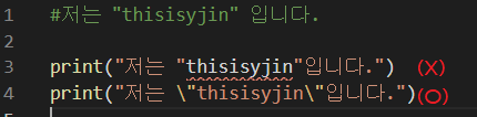 다음과 같이 문장에 " " 가 포함된 경우 print문을 감싸는 ""와 혼동되어 오류가 발생한다.