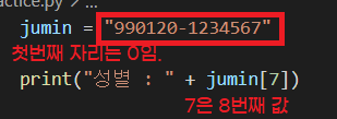 즉, jumin 변수의 8번째 글자를 가져오기 위해선 print( jumin[7] ) 을 입력.
