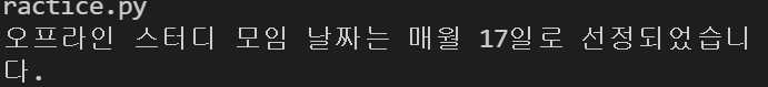 print("오프라인 스터디 모임 날짜는 매월 " + str(date) + "일로 선정되었습니다.")