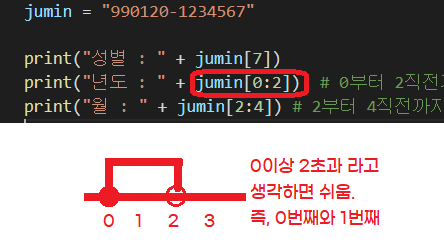 | 시작값이 0이면 > 0은 생략해도 좋다. 예> jumin[:6] = 처음부터 6번째 직전까지. |