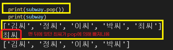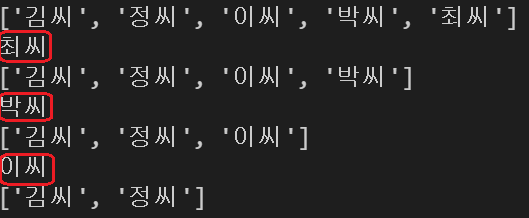 ** 한명씩 뒤에서부터 하나씩 꺼내기 = pop() 함수