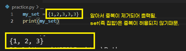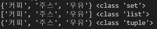 | 변수명 = set( [요소1, 요소2, 요소3] ) | [ ] 안에 적는 것은 리스트 이므로 , 리스트에 set()함수로 감싸준다. |