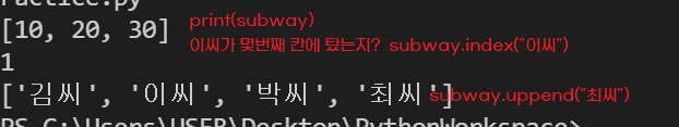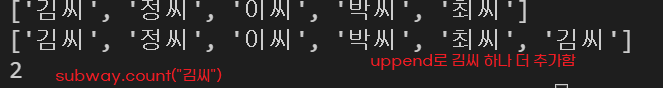 ** 만약 김씨와 이씨 사이에 정씨를 추가하고 싶다면? = insert(인덱스,추가할것)