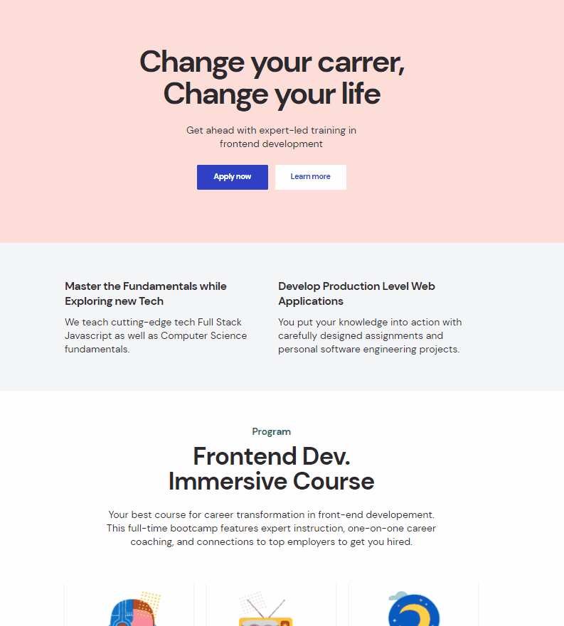 Program Frontend Dev. Immersive Course Your best course for career transformation in front-end developement. This full-time bootcamp features expert instruction, one-on-one career coaching, and connections to top employers to get you hired.