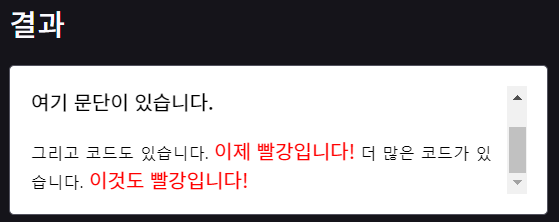 <span>μ΄κ±΄ λΉ¨κ°μ΄ μλλλ€.</span> <p>μ¬κΈ° λ¬Έλ¨μ΄ μμ΅λλ€.</p> <code>κ·Έλ¦¬κ³ μ½λλ μμ΅λλ€.</code> <span>μ΄μ λΉ¨κ°μ λλ€!</span> <code>λ λ§μ μ½λκ° μμ΅λλ€.</code> <span>μ΄κ²λ λΉ¨κ°μ λλ€!</span>