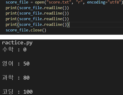 readline() - 파일의 한 줄을 가져와 문자열로 반환. 파일 포인터는 그 다음줄로 이동. |