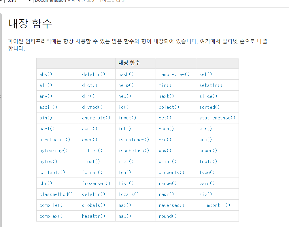 ++) 구글에 list of python builtins 로 검색하면, 아래 사이트가 나온다.