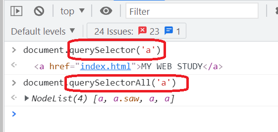 앞서 사용했던 querySelector을 사용한다면, 맨 첫번째로 나오는 <a>태그 하나만 출력해준다.