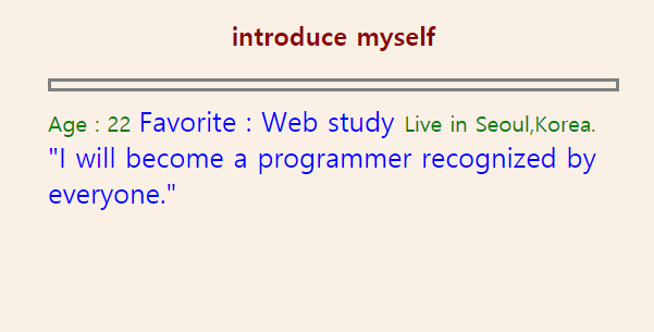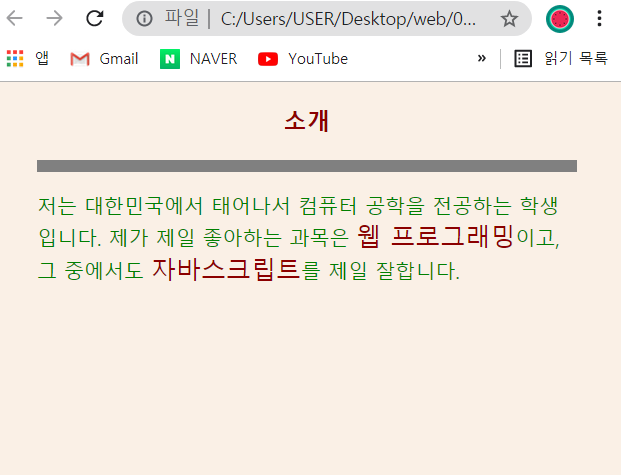 <p> 저는 대한민국에서 태어나서 컴퓨터 공학을 전공하는 학생입니다. 제가 제일 좋아하는 과목은 <span>웹 프로그래밍</span>이고, 그 중에서도 <span>자바스크립트</span>를 제일 잘합니다.
