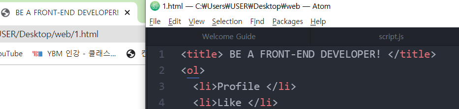 <meta charset="utf-8"> -> 글씨 깨짐 방지. 우리가 아톰에서 utf-8로 작성하니까 맞춰줘야함.