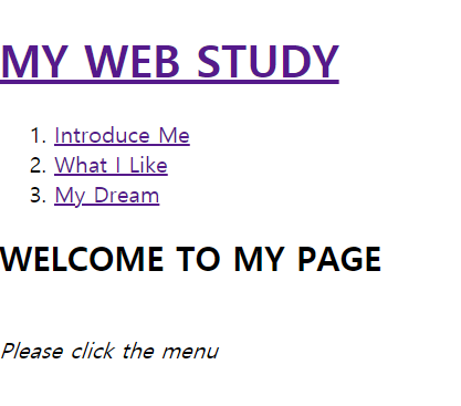 | <h1><a href="index.html">MY WEB STUDY</a></h1> <ol> <li><a href="1.html">Introduce Me</a></li> <li><a href="2.html">What I Like</a></li> <li><a href="3.html">My Dream</a></li> </ol> |
