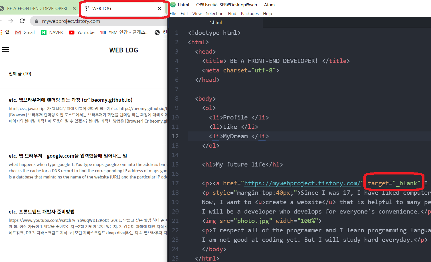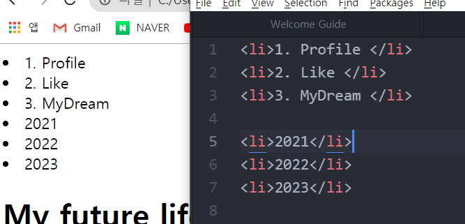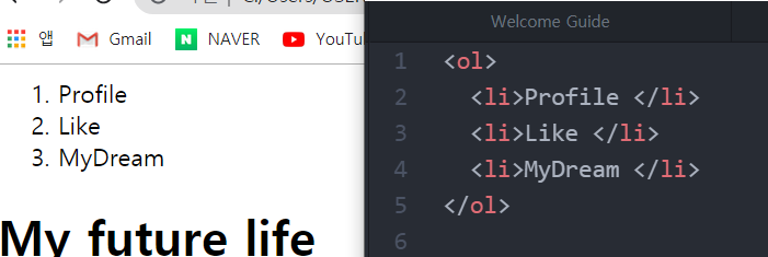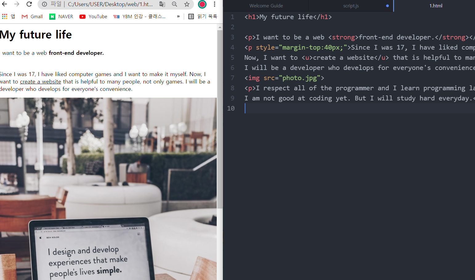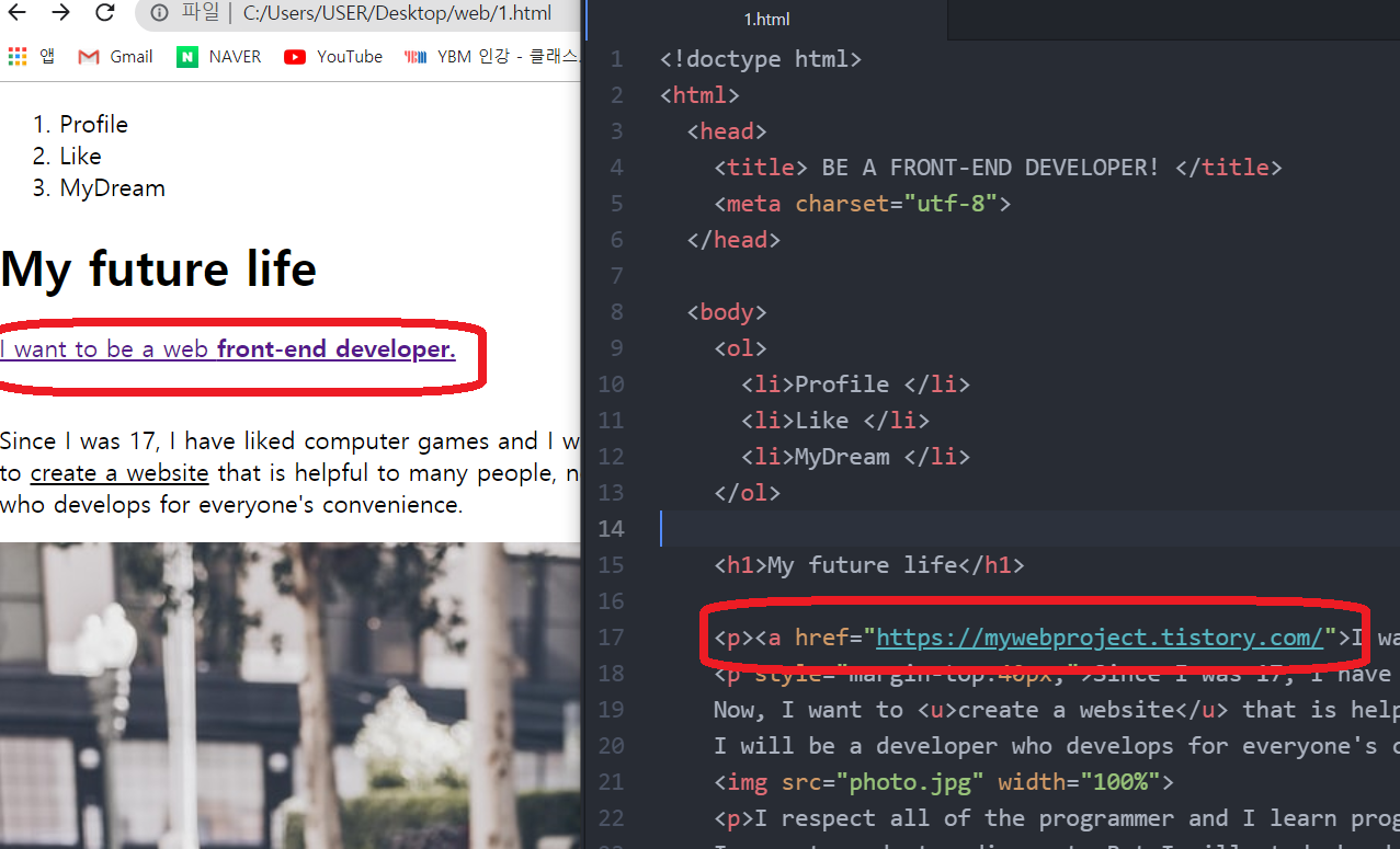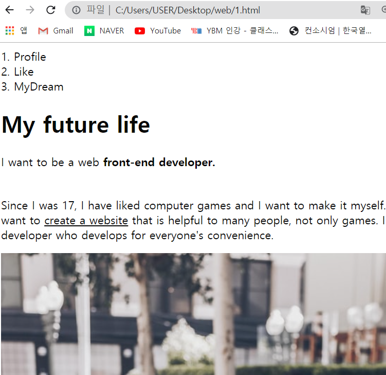 | <!doctype html> <html> <head> <title> BE A FRONT-END DEVELOPER! </title> <meta charset="utf-8"> </head> <body> <ol> <li>Profile </li> <li>Like </li> <li>MyDream </li> </ol> <h1>My future life</h1> <p>I want to be a web <strong>front-end developer.</strong></p> <p style="margin-top:40px;">Since I was 17, I have liked computer games and I want to make it myself. Now, I want to <u>create a website</u> that is helpful to many people, not only games. I will be a developer who develops for everyone's convenience.</p> <img src="photo.jpg" width="100%"> <p>I respect all of the programmer and I learn programming languages by myself. I am not good at coding yet. But I will study hard everyday.</p> </body> </html> |