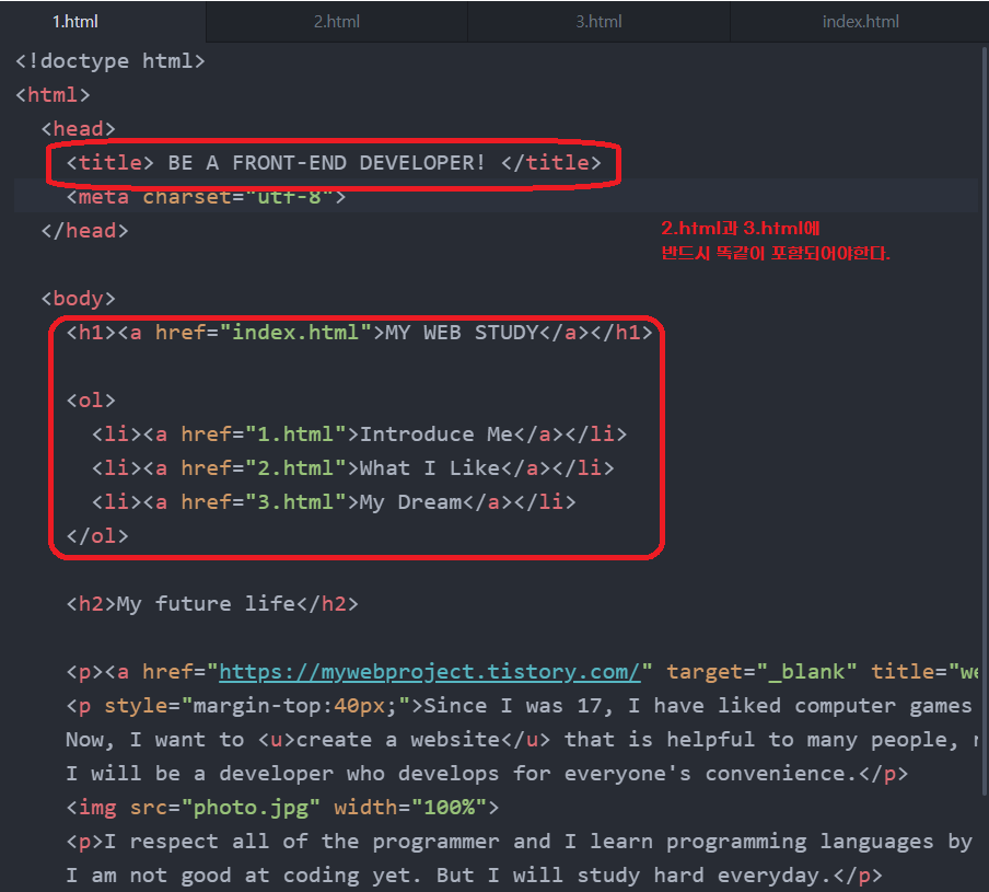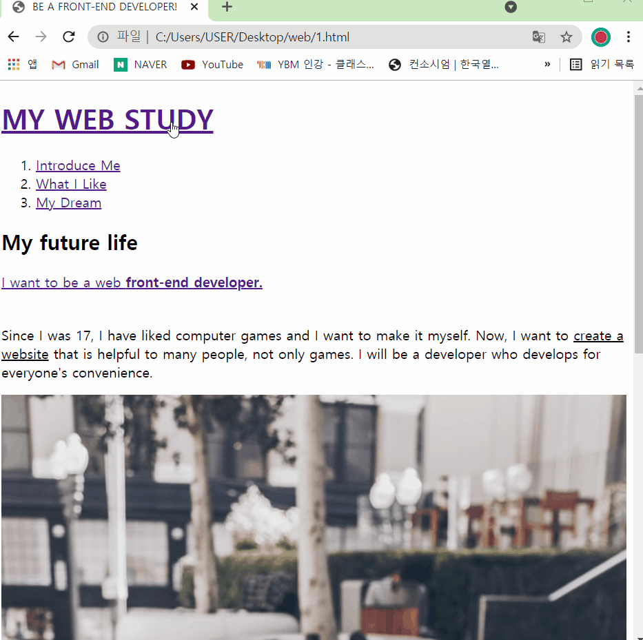 <!doctype html> <html> <head> <title> BE A FRONT-END DEVELOPER! </title> <meta charset="utf-8"> </head> <body> <h1><a href="index.html">MY WEB STUDY</a></h1> <ol> <li><a href="1.html">Introduce Me</a></li> <li><a href="2.html">What I Like</a></li> <li><a href="3.html">My Dream</a></li> </ol> <h2> My dream </h2> <p style="margin-top:40px;"> <u> Front-end </u> Developer </p> <p> I want to make my own websites. </p> <img src="photo3.jpg" width="100%"> </body> </html> |